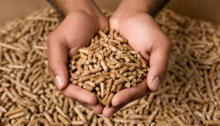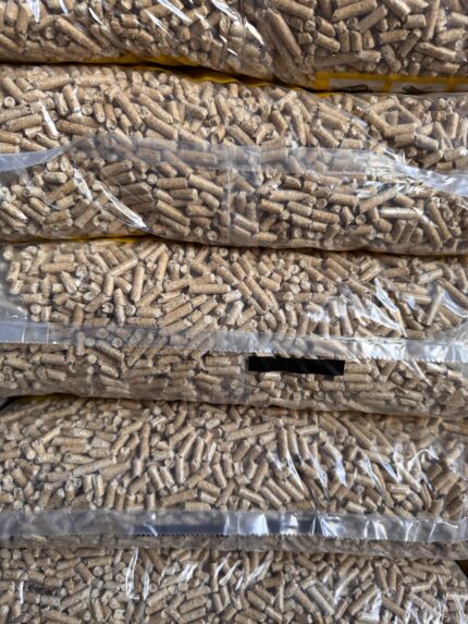 Wood pellets in transparent bags as sustainable fuel for heating.